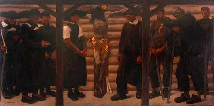 Albin Egger-Lienz: „Die Wallfahrer“ (200 x 402 cm, 1906; Kunsthalle Mannheim). Die rechte Seite ist dem Motiv seines zuvor gefertigten Gemäldes „Nach dem Friedensschluß 1809“ (191 × 330 cm, 1902; Belvedere, Wien) ähnlich.